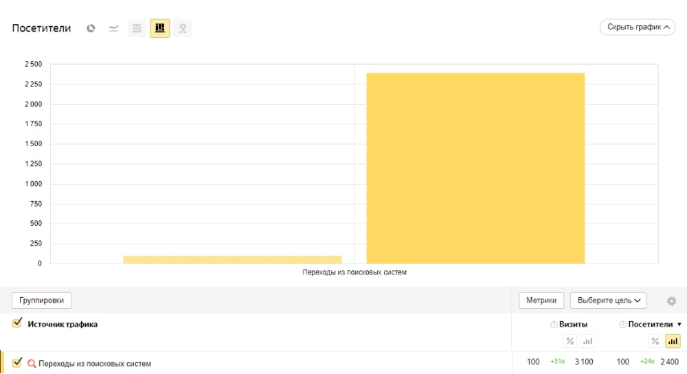 2. Переходы из поисковых систем увеличились со 100 посетителей до 2400