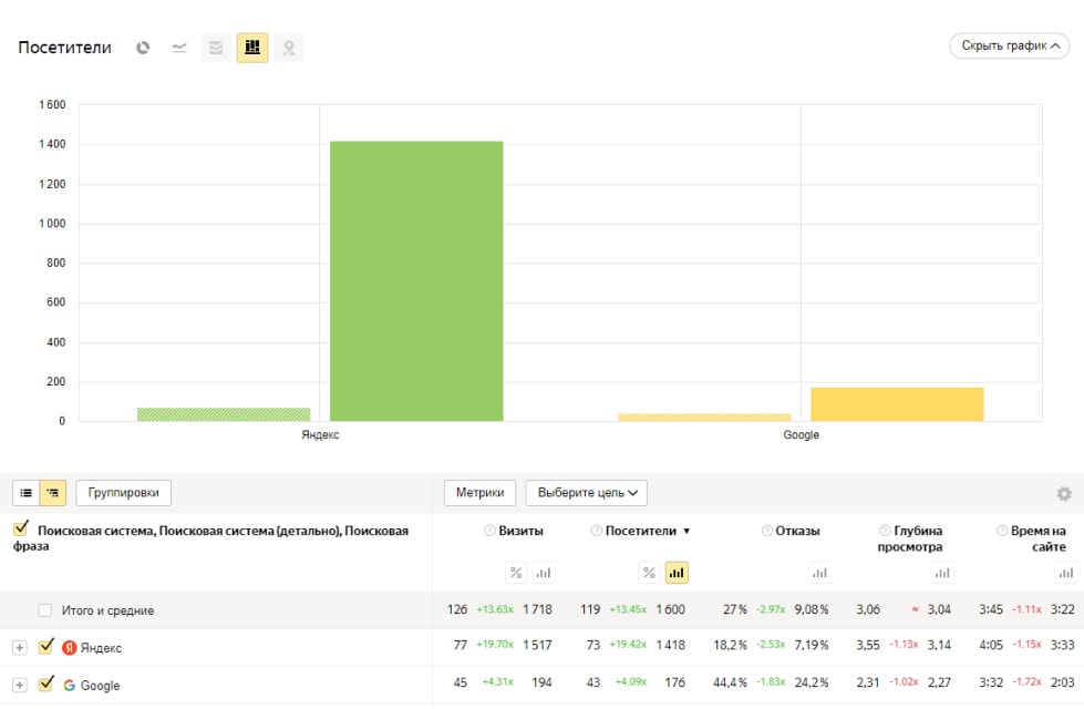 1. Нам удалось увеличить количество посетителей со 119 до 1600 в Яндекс и с 73 до 1418 в Google.