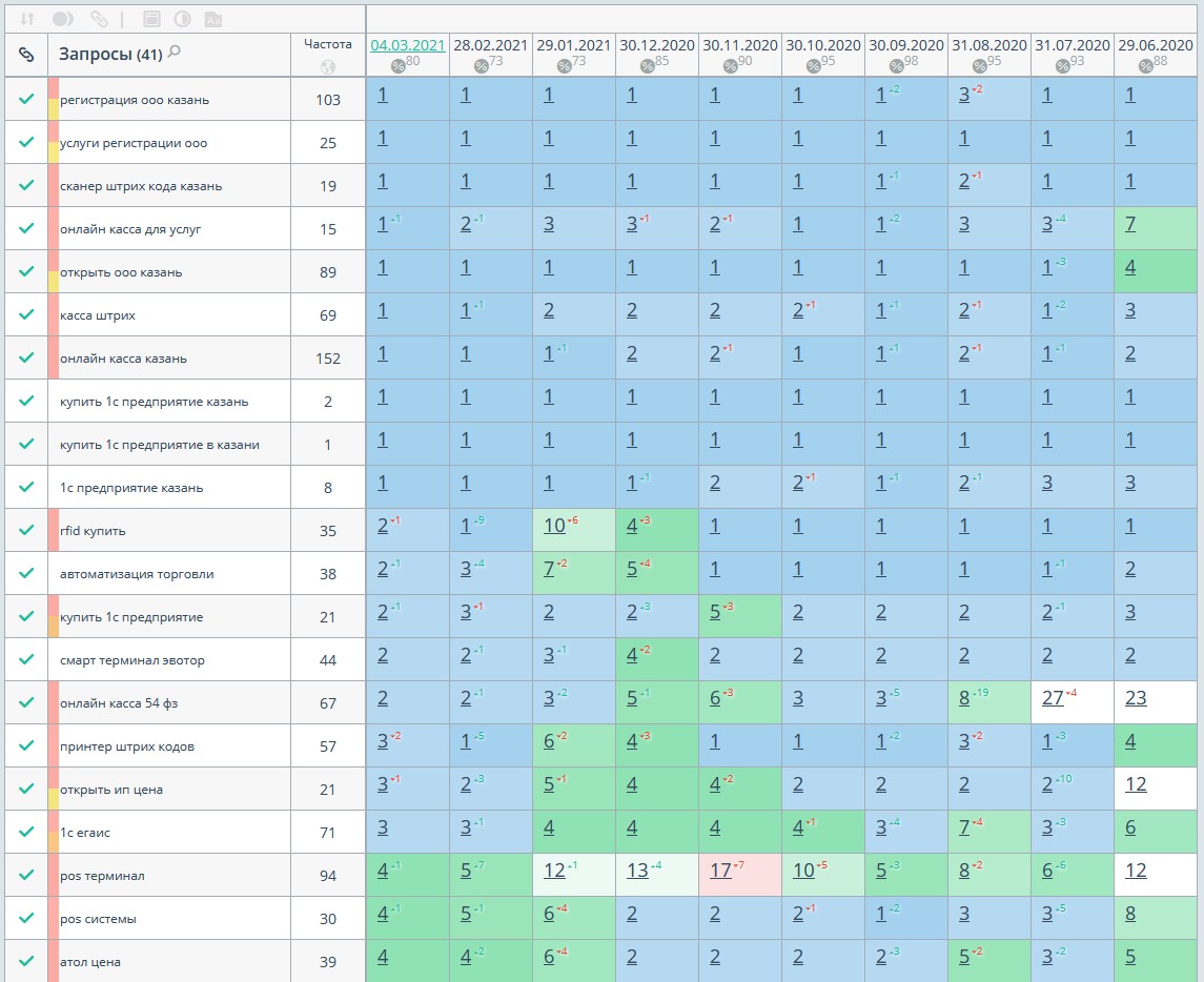 Таблица некоторых запросов с позициями сайта с начала работ по SEO продвижению
