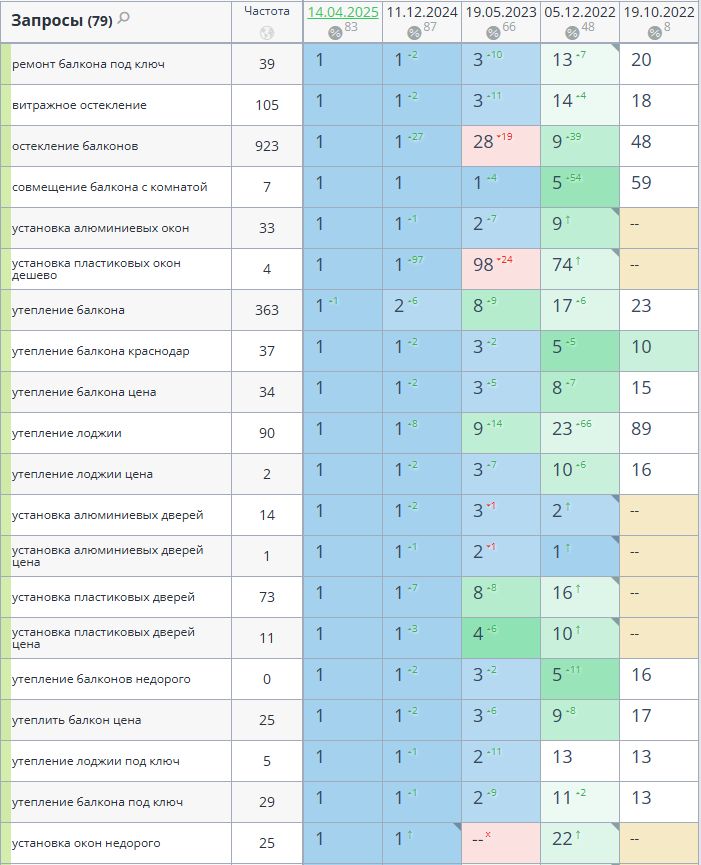 - Сбор высокочастотных и среднечастотных запросов по теме услуг ремонта и отделки балконов, установки окон.